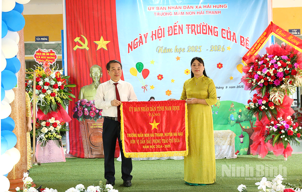 Đồng chí Bùi Hoàng Hà, Ủy viên Ban Thường vụ Tỉnh ủy, Phó Chủ tịch HĐND tỉnh trao Cờ thi đua xuất sắc của UBND tỉnh cho Trường Mầm non Hải Thanh. Ảnh: Phạm Đại