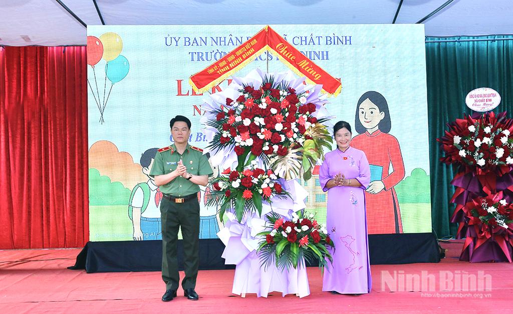 Đồng chí Thiếu tướng Nguyễn Hữu Mạnh, Ủy viên Ban Thường vụ Tỉnh ủy, Giám đốc Công an tỉnh tặng hoa chúc mừng thầy và trò Trường THCS Hồi Ninh. Ảnh: Anh Tuấn