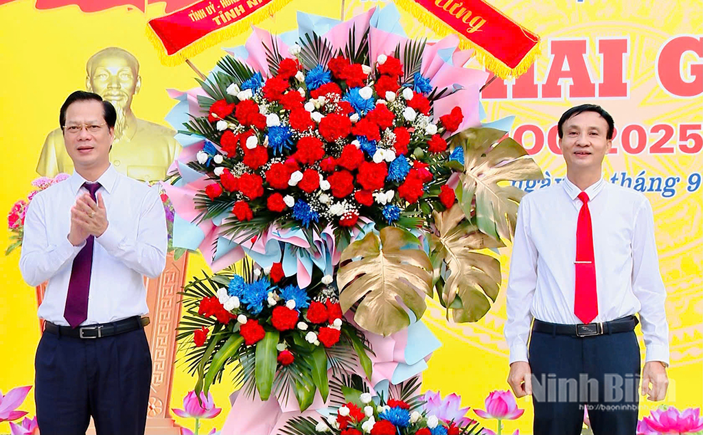 Tại lễ khai giảng, đồng chí Hoàng Nguyên Dự, Ủy viên Ban Thường vụ Tỉnh ủy, Phó Bí thư chuyên trách Đảng ủy các cơ quan Đảng tỉnh đã tặng hoa chúc mừng thày, trò Trường THPT Yên Khánh A.
