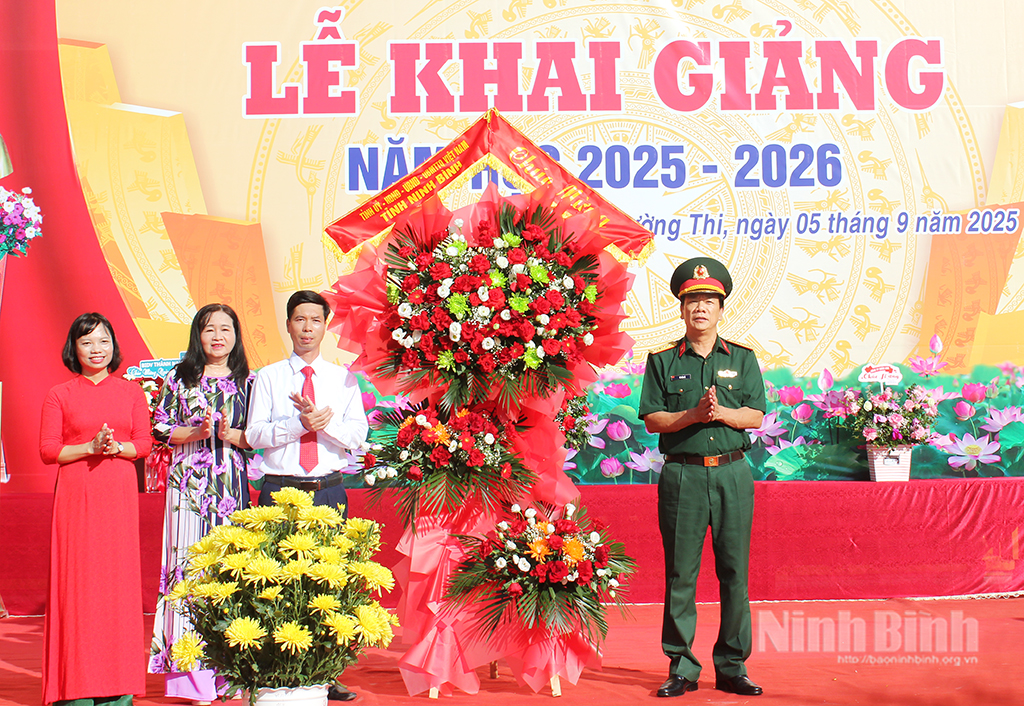 Đồng chí Phó Chính ủy Bộ Chỉ huy Quân sự tỉnh Tô Văn Hà tặng lẵng hoa tươi thắm chúc mừng thầy và trò Trường THPT Nguyễn Đức Thuận đạt được nhiều thành công mới trong năm học 2025-2026.