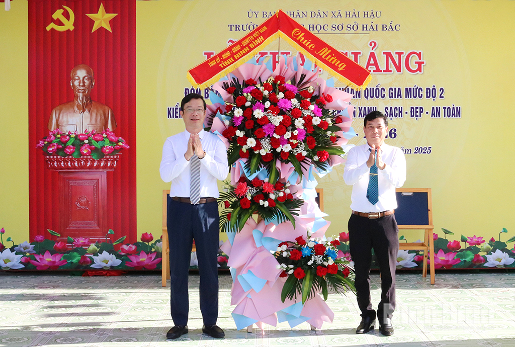 Đồng chí Nguyễn Minh Tiến, Ủy viên Ban Thường vụ Tỉnh ủy, Trưởng Ban Nội chính Tỉnh ủy tặng hoa chúc mừng tập thể cán bộ, giáo viên, học sinh Trường THCS Hải Bắc (xã Hải Hậu).